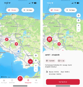 Tüm LUKOIL istasyonları burada görüntülenir. Kullanıcı konum izni vermişse seçtiği istasyona olan uzaklığını, istasyonun konumunu ve istasyondaki akaryakıt birim fiyatlarını görüntüleyebilir. ‘Yol Tarifi Al’ diyerek telefonunda bulunan harita ile seçtiği istasyona yönlendirilir.