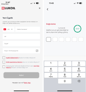 Zorunlu ‘Telefon Numarası, Ad - Soyad, Doğum Tarihi’ alanları doldurulduğunda ‘Devam Et’ diyerek telefon numarasına gelen SMS’teki 6 haneli doğrulama kodunu girilerek üyelik işlemi tamamlanır.