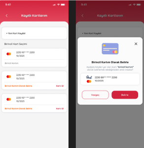 Kullanıcı kayıtlı kartı yoksa ödeme ekranında kart kaydedebilir, kayıtlı kartları var ise, o kartlar arasından seçim yapıp ödeme işleminde kullanabilir.