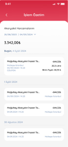 Yapılan akaryakıt alışveriş detayları burada görüntülenir, tarihe göre filtrelenebilir.