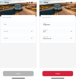 ‘Yeni Araç Ekle’ kısmı tıklanarak, ‘Plaka, Araç Tipi ve Yakıt Tipi’ alanları doldurulur. ‘Garajım’ bölümüne toplam 5 adet araç eklenebilir. Silinmek istenen araçlar ‘Düzenle’ tıklanarak ‘Garajım’ bölümünden silinebilir.