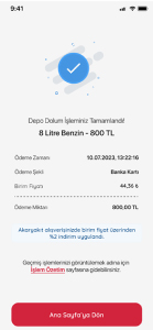 Satış işlemi başarılı olduğunda kullanıcıya aldığı yakıt miktarı, litresi, ödeme zamanı, ödeme şekli, birim fiyatı ve birim fiyatta kazandığı indirim miktarını görüntüler. Bu ekrandan ‘İşlem Özetine’ veya ‘Ana Sayfa ’ya gidebilir.