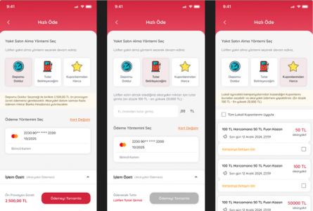 Kullanıcı kazandığı kuponları burada görüntüleyebilir, birden fazla kupon seçerek tutarı kadar akaryakıt satın alabilir.