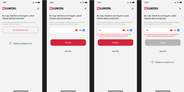 Sisteme kayıt olunan telefondan başka bir cihazla giriş yapılmak istendiğinde onay için ‘Bu Hesap Bana Ait’ butonuna tıklayarak hesapta kayıtlı kredi kartının son 4 hanesi girilmelidir. Sistemde kayıtlı bir kredi kartı yoksa veya kart numarası hatırlanmıyorsa ‘Yardıma mı ihtiyacın var?’ yazısına tıklayarak müşteri hizmetlerinden destek alınmalıdır.