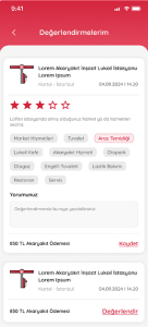 Akaryakıt alışverişi yapıldığında kullanıcının ‘Değerlendirmelerim’ sayfasında görüntülenir, kullanıcı aldığı hizmetleri seçebilir, puanlayabilir ve yorum ekleyebilir.