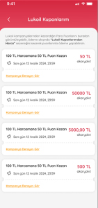 Kampanyalardan kazanılan kuponlar ve detayları bu alanda görüntülenir. ‘Kampanya Detayını Gör’ bölümü tıklanarak kuponun hangi kampanyadan kazanıldığı detayına erişilebilir.