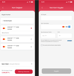 Kullanıcı kayıtlı kartı yoksa ödeme ekranında kart kaydedebilir, kayıtlı kartları var ise, o kartlar arasından seçim yapıp ödeme işleminde kullanabilir.