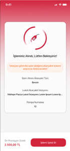 Kullanıcı ödeme işlemini tamamladıktan sonra, pompa dolum işlemine başlayana kadar bu ekranda kalır, 1 dakika içerisinde dolum başlamazsa kullanıcı bilgilendirilir ve satış iptal edilir.